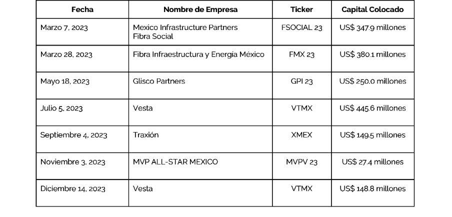 Para el año 2024 esperaríamos ver actividad en los sectores de bienes raíces y logística, a medida que los vehículos que han salido a levantar capital en los mercados durante los últimos meses empiecen a utilizarlo. Les mostramos un resumen las principales colocaciones a lo largo de 2023 (US$1,749 millones):